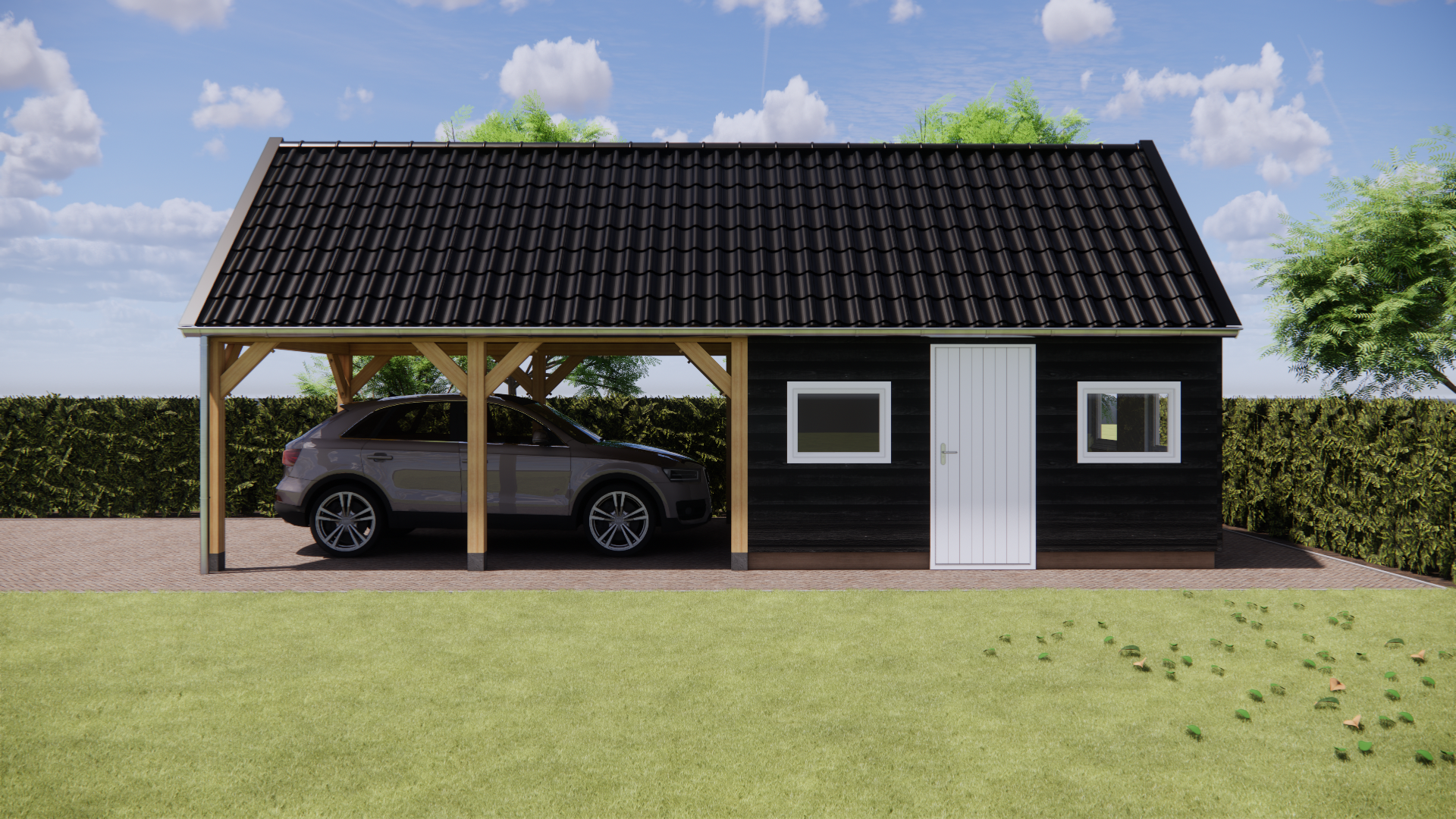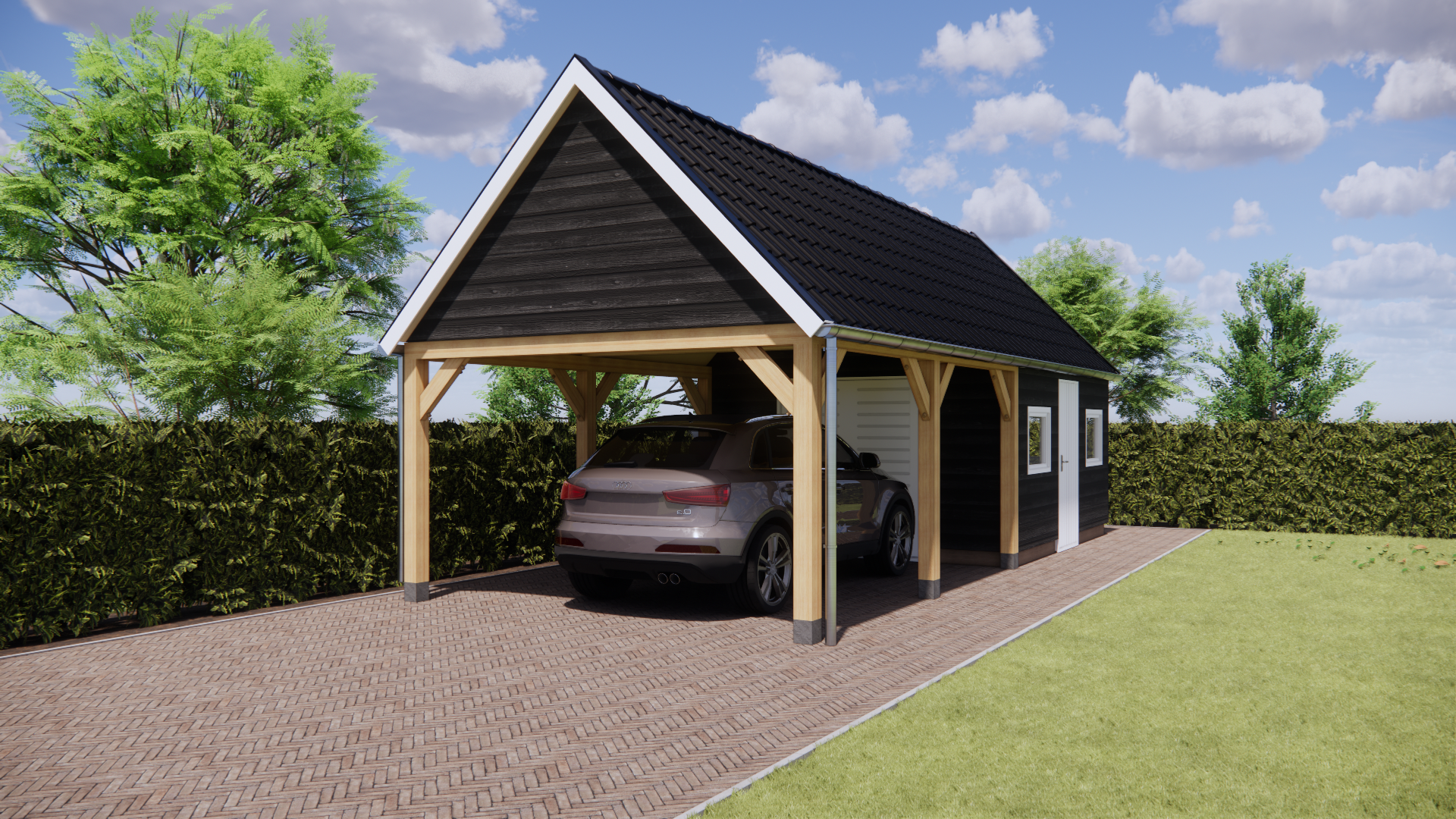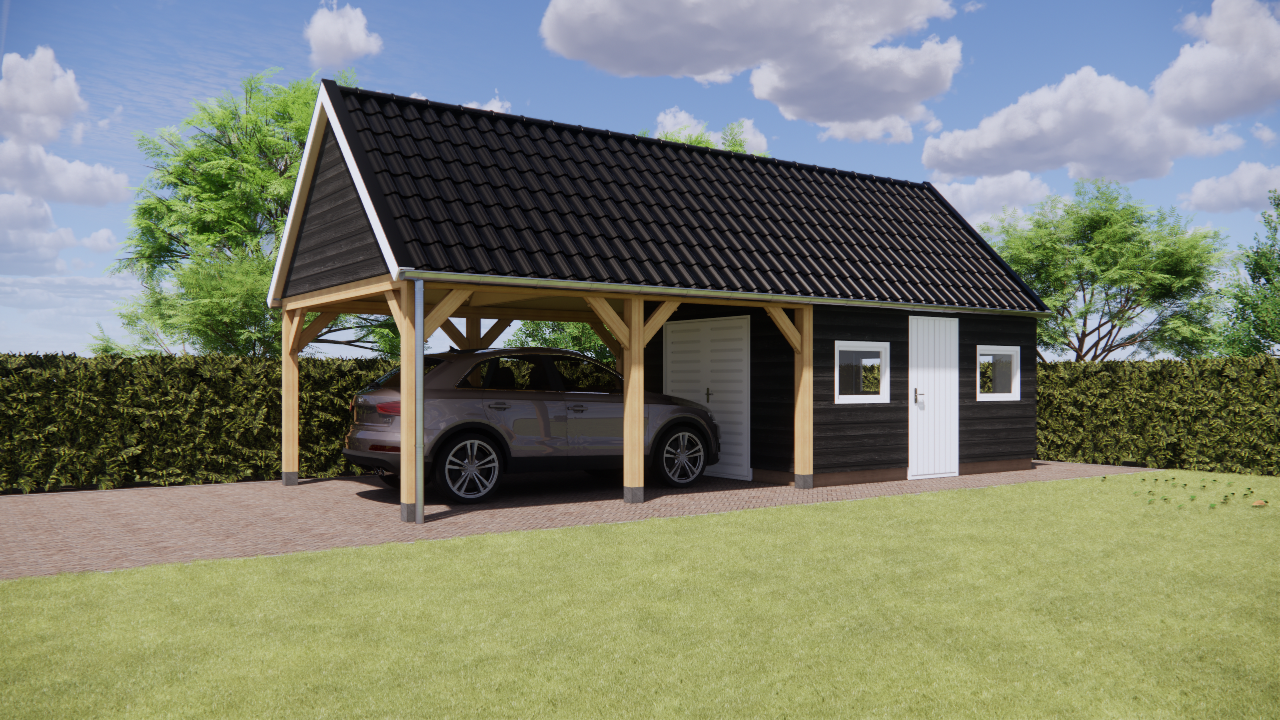 Houten schuur met carport.