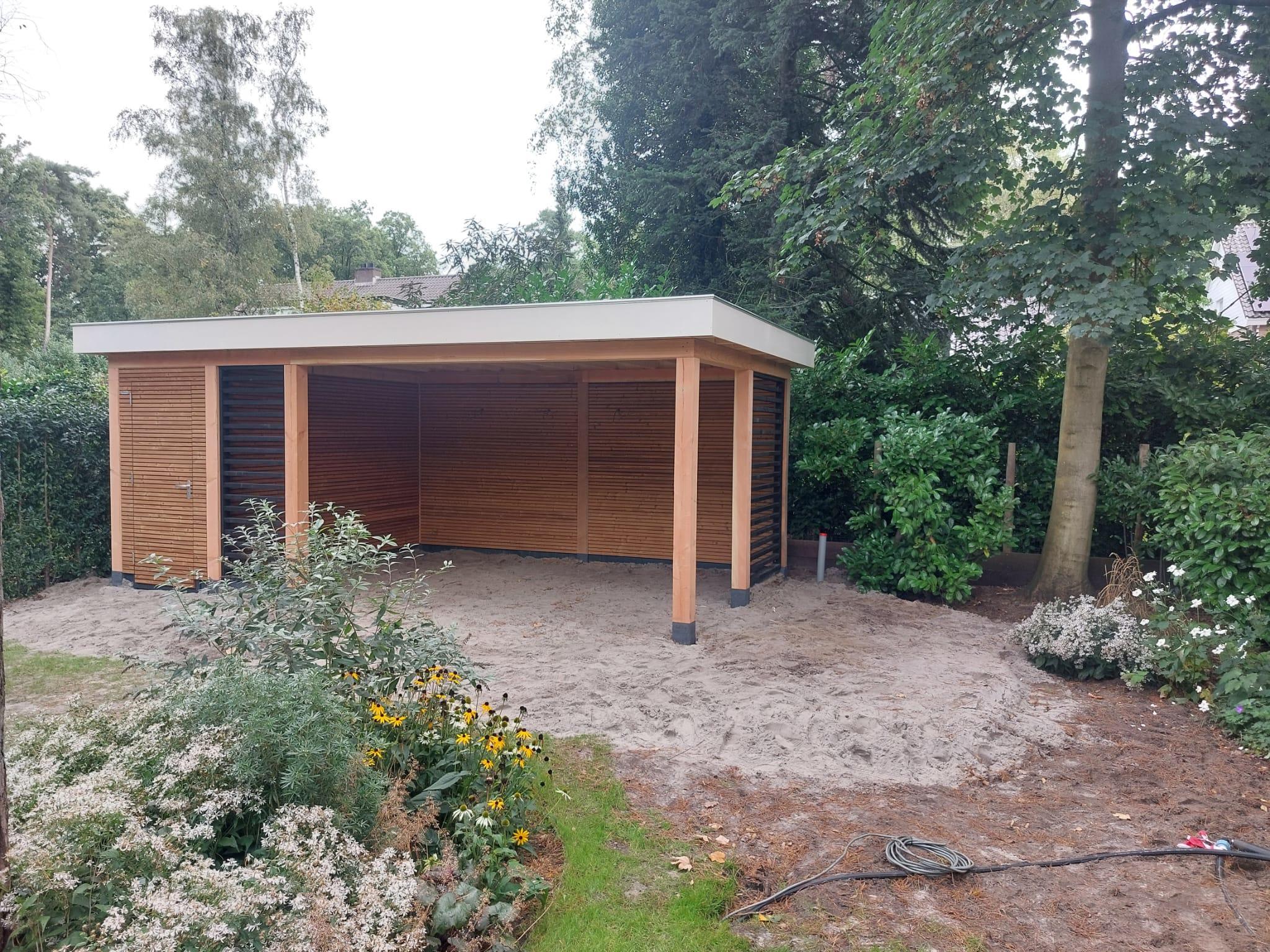 Modern vormgegeven tuinhuis met berging en overkapping. Het berging gedeelte is voorzien van een open gevel bekleding. De wanden van de overkapping, boeidelen en plafond zij uitgevoerd in Rockpannel.